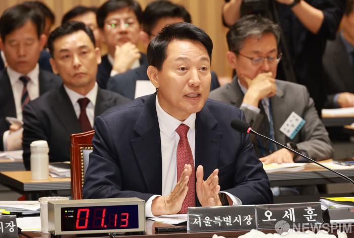 [서울=뉴스핌] 김학선 기자 = 오세훈 서울시장이 23일 서울시청에서 열린 국회 행정안전위원회 국정감사에서 의원질의에 답하고 있다. 2025.10.23 yooksa@newspim.com |