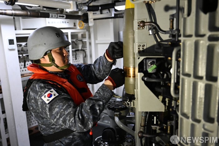 [평택=뉴스핌] 사진공동취재단 = 25일 서해 중부 해상에서 실시된 해상기동훈련에서 승조원이 대전함(FFG-II, 3100톤) 실사격 훈련을 위해 함포탄을 장전을 하고 있다. 해군은 제10회 서해수호의 날을 맞아 3월 25일부터 27일까지 동·서·남해 전 해역에서 훈련을 진행한다. 2025.03.26 photo@newspim.com |