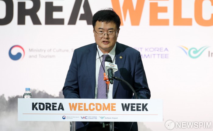 [영종도=뉴스핌] 최지환 기자 = 김대현 문화체육관광부 차관이 23일 오전 인천국제공항 제1여객터미널에서 열린 2025 환영주간 개막행사에서 인사말을 하고 있다. 2025.10.23 choipix16@newspim.com