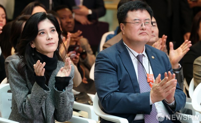 [영종도=뉴스핌] 최지환 기자 = 이부진 한국방문의해 위원장(왼쪽)과 김대현 문화체육관광부 차관이 23일 오전 인천국제공항 제1여객터미널에서 열린 2025 환영주간 개막행사에서 박수를 치고 있다. 2025.10.23 choipix16@newspim.com