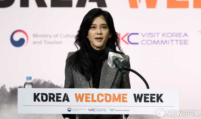 [영종도=뉴스핌] 최지환 기자 = 이부진 한국방문의해위원회 위원장이 23일 오전 인천국제공항 제1여객터미널에서 열린 2025 환영주간 개막행사에서 인사말을 하고 있다. 2025.10.23 choipix16@newspim.com
