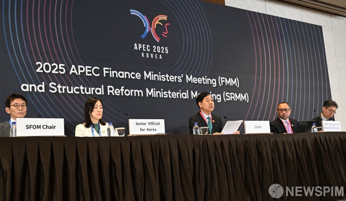 [서울=뉴스핌] 구윤철 부총리 겸 기획재정부 장관이 23일 인천 인스파이어 리조트에서 열린 아시아-태평양경제협력체(APEC) 재무.구조개혁장관회의 합동 기자회견에서 모두 발언을 하고 있다.왼쪽부터 윤정인 기재부 APEC 재무.구조개혁장관회의 추진단장, 이지윤 외교부 국장, 구윤철 부총리, 에르아르도 페드로사 APEC 사무총장, 제임스 딩 APEC 경제위원회(EC) 의장[사진=기획재정부] 2025.10.23 photo@newspim.com