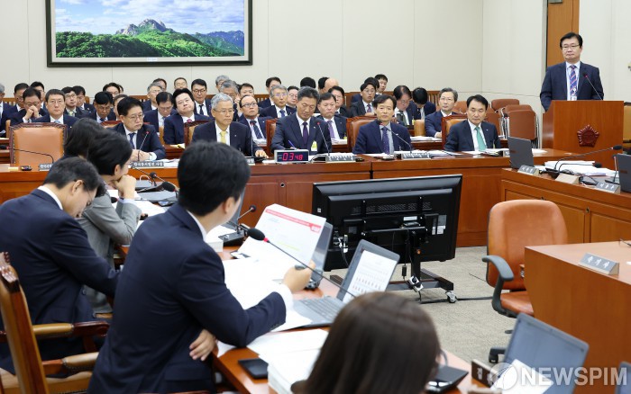 [서울=뉴스핌] 정일구 기자 = 정용기 한국지역난방공사 사장이 23일 서울 여의도 국회 기후에너지환경노동위원회에서 열린 국정감사에서 우재준 국민의힘 의원 질의를 경청하고 있다. 2025.10.23 mironj19@newspim.com