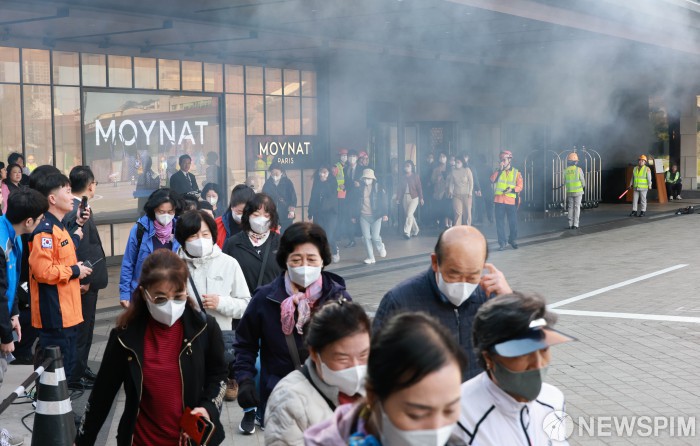 [서울=뉴스핌] 김학선 기자 = 24일 오전 서울 중구 신라호텔에서 열린 '2025 안전한국훈련'에서 투숙객들이 대피 훈련을 하고 있다. 이번 훈련은 호텔 주방에서 음식 조리 중에 화재가 발생한 상황을 가정해 진행됐다. 2025.10.24 yooksa@newspim.com