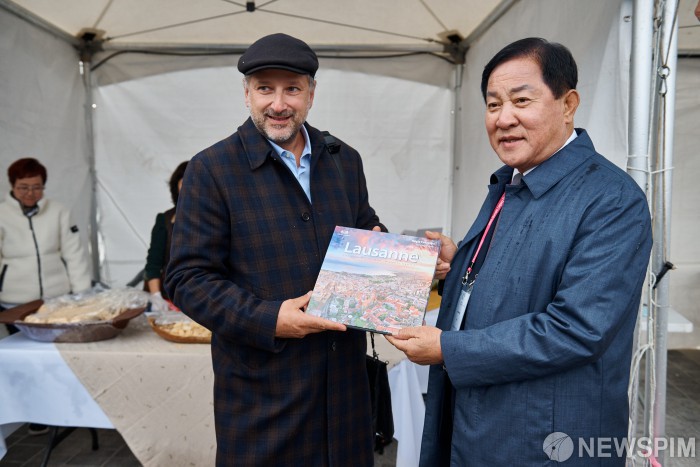 [서울=뉴스핌] 심재국 평창군수가 그로고리 주노드 연맹회장과 프리마켓 현장에서 기념사진을 찍고 있다. [사진=2018평창기념재단] 2025.10.24 photo@newspim.com