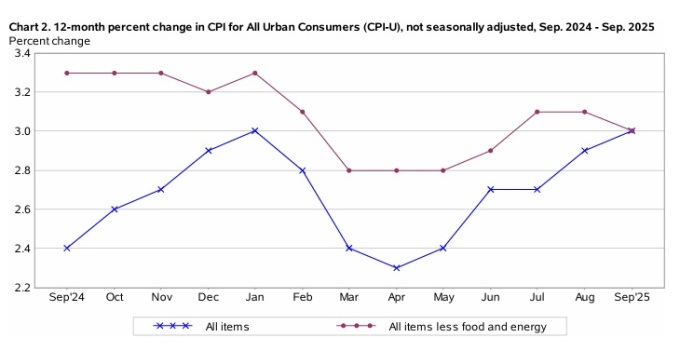 미 노동통계국(BLS)이 25일(현지시간) 발표한 자료에 따르면, 9월 CPI는 전월 대비 0.3% 상승, 전년 동월 대비 3.0% 상승했다.