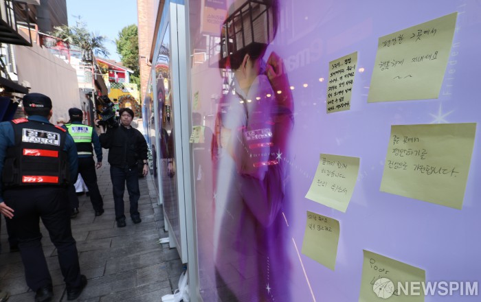 [서울=뉴스핌] 김학선 기자 = 10·29 이태원 참사 3주기를 앞둔 25일 참사 현장인 이태원역 1번 출구 앞 ‘10·29 기억과 안전의 길’에서 경찰이 순찰을 하고 있다. 2025.10.25 yooksa@newspim.com