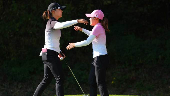 | [서울=뉴스핌] 장환수 스포츠전문기자= 고진영(왼쪽)과 후루에 아야카가 25일 한화 라이프플러스 인터내셔널 크라운 셋째 날 포볼 경기를 무승부를 끝낸 뒤 포옹하고 있다. [사진=LPGA] 2025.10.25 zangpabo@newspim.com |