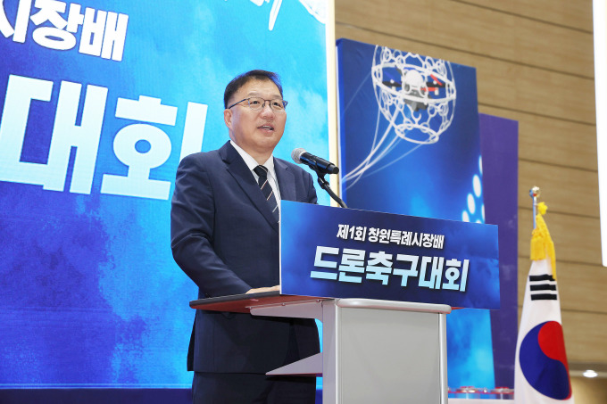 | 장금용 경남 창원시장 권한대행이 25일 로봇랜드 컨벤션센터에서 열린 제1회 창원특례시장배 드론 축구대회'에서 축사하고 있다. [사진=창원시] 2025.10.26 |