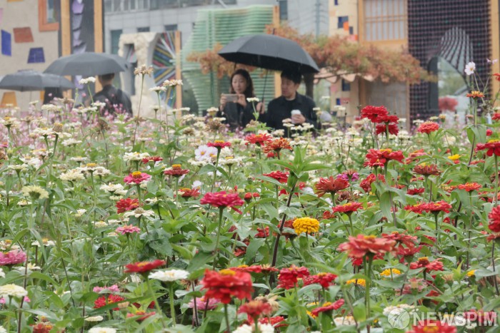 [서울=뉴스핌] 이길동 기자 = 가랑비가 내리는 26일 서울 종로구 송현열린광장에서 관광객과 시민들이 꽃길을 산책하며 가을의 정취를 만끽하고 있다. 2025.10.26 gdlee@newspim.com