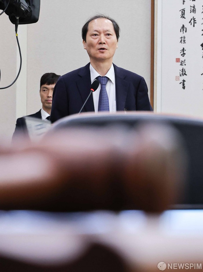 [서울=뉴스핌] 윤창빈 기자 = 이완규 전 법제처장이 27일 서울 여의도 국회에서 열린 법제사법위원회의 대검찰청 국정감사에서 선서 거부의 이유를 밝히고 있다. 2025.10.27 pangbin@newspim.com