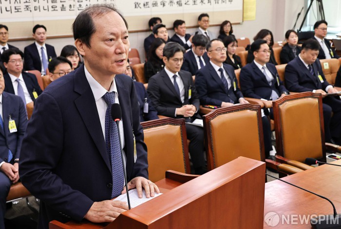 [서울=뉴스핌] 윤창빈 기자 = 이완규 전 법제처장이 27일 서울 여의도 국회에서 열린 법제사법위원회의 대검찰청 국정감사에서 선서 거부의 이유를 밝히고 있다. 2025.10.27 pangbin@newspim.com