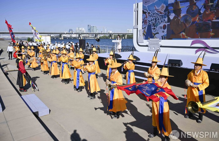 [서울=뉴스핌] 청사사진기자단 =27일 서울 여의도 한강공원 물빛무대에서 열린 자전거 신(新)조선통신사 행사에서 취타대의 연주와 함께 통신사 대원들이 입장하고 있다.2025.10.27 photo@newspim.com