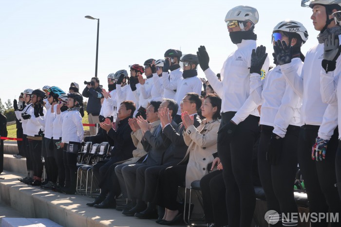 [서울=뉴스핌] 청사사진기자단 =27일 서울 여의도 한강공원 물빛무대에서 열린 자전거 신(新)조선통신사 행사에서 통신사 대원들이 선서를 하고 있다. 2025.10.27 photo@newspim.com