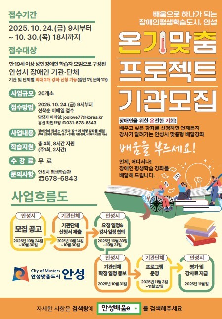 [안성=뉴스핌] 이석구 기자 = 경기 안성시가 장애인 평생학습 권리 보장과 이동 불편 해소를 위해 '찾아가는 장애인 평생학습 온기맞춤 프로젝트' 참여 기관·단체를 오는 30일까지 모집한다.