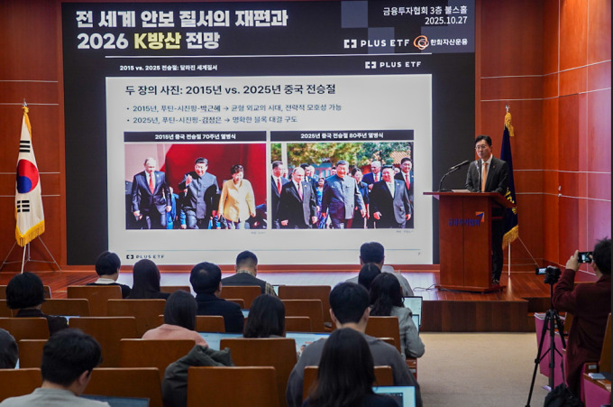 한화자산운용은 27일 서울 여의도 금융투자협회 불스홀에서 '전 세계 안보 질서의 재편과 2026 K방산 전망'을 주제로 기자간담회를 개최했다. 행사에는 최영진 한화자산운용 최고마케팅책임자(CMO), 이선엽 AFW파트너스 대표, 장남현 한국투자증권 연구위원이 발표자로 참석했다.