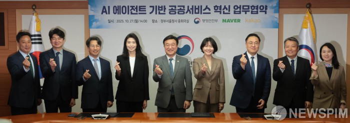 [서울=뉴스핌] 이길동 기자 = 윤호중 행정안전부 장관(가운데)이 27일 서울 종로구 정부서울청사에서 열린 AI 에이전트 기반 공공서비스 혁신 업무협약식에서 협약서 서명후 네이버 최수연 대표(오른쪽에서 네번째), 카카오 정신아 대표(왼쪽에서 네번째)를 비롯한 참석자들과 기념촬영 하고 있다. 2025.10.27gdlee@newspim.com