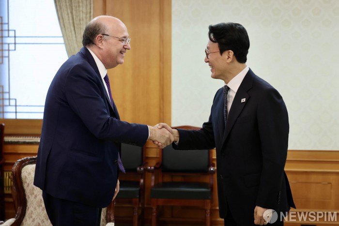 [서울=뉴스핌]김민석 국무총리가 27일 서울 종로구 정부서울청사에서 일랑 고우드파잉 미주개발은행(IDB) 총재를 접견하고 있다. [사진=총리실] 2025.10.27 photo@newspim.com