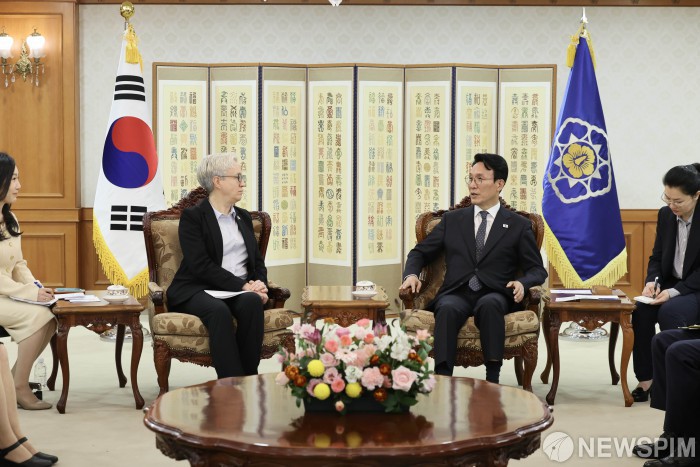 [서울=뉴스핌] 김민석 국무총리가 27일 서울 종로구 정부서울청사에서 티나 코텍(Tina Kotek) 미국 오리건 주지사를 접견하고 있다. [사진=총리실] 2025.10.27 photo@newspim.com