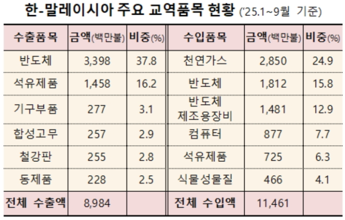 말레이시아는 팜유(세계 2위), 주석(세계 12위), 천연가스(세계 12위) 등 풍부한 천연자원 보유국이자 반도체, 화학 등 여러 제조업 분야의 글로벌 공급망에서 중요한 위치를 차지하고 있어 공급망·자원 등 분야에서 협력 잠재력이 매우 큰 국가로 평가된다.