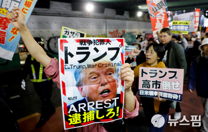 | 27일 도쿄에서 열린 도널드 트럼프 미국 대통령의 일본 방문 반대 집회에서 시위대가 '트럼프 체포'를 촉구하는 포스터를 들고 있다. [사진=로이터 뉴스핌] |