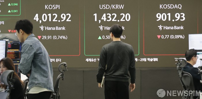 | [서울=뉴스핌] 양윤모 기자 = 28일 오전 코스피가 전장 종가보다 29.91 포인트(0.74%) 하락하며 4012.92로, 코스닥은 0.77 포인트(0.09%) 하락한 901.93으로 장을 시작한 가운데, 서울 중구 하나은행 딜링룸에서 직원들이 업무를 보고 있다. 서울외환시장에서 달러/원 환율은 전장 대비 0.50원 상승한 1432.20원에 거래를 시작했다. 2025.10.28 yym58@newspim.com |