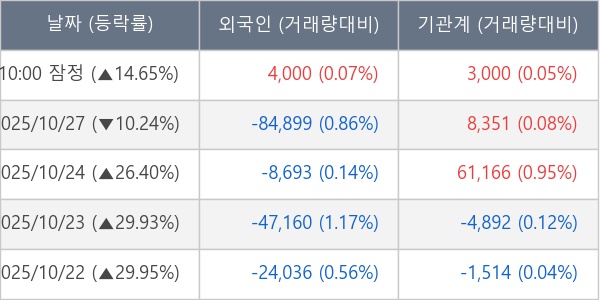 [서울=뉴스핌] 로보뉴스 = 28일 10시 15분 현재 이수화학(005950)은 외국인과 기관이 각각 0.40 만 주, 0.30 만 주 순매수(잠정) 하면서 전일 대비 14.65% (현재가 12,760원) 상승하고 있다.