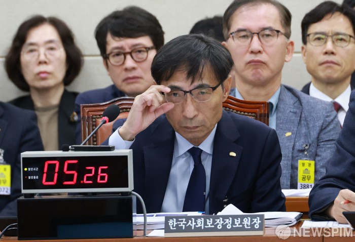 [서울=뉴스핌] 김학선 기자 = 김현준 한국사회보장정보원장이 28일 서울 여의도 국회 보건복지위원회에서 열린 한국노인인력개발원, 한국사회보장정보원 등에 대한 국정감사에서 의원질의를 듣고 있다. 2025.10.28 yooksa@newspim.com