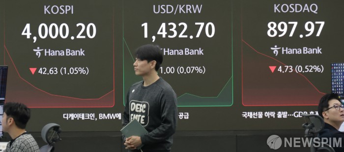 | [서울=뉴스핌] 양윤모 기자 = 28일 오전 코스피가 전장 종가보다 42.63 포인트(1.05%) 하락하며 4000.20으로, 코스닥은 4.73 포인트(0.52%) 하락한 897.97로 장을 시작한 가운데, 서울 중구 하나은행 딜링룸에서 직원들이 업무를 보고 있다. 서울외환시장에서 달러/원 환율은 전장 대비 1.00원 상승한 1432.70원에 거래를 시작했다. 2025.10.28 yym58@newspim.com |