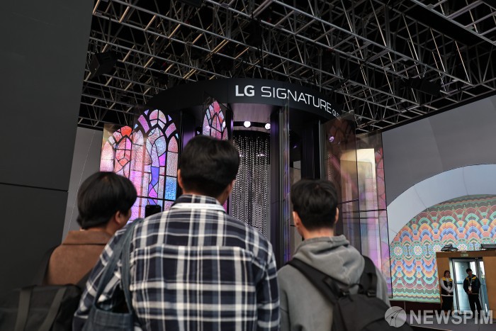 [경주=뉴스핌] 윤창빈 기자 = 28일 경북 경주 엑스포공원 에어돔에서 열린 'K-테크 쇼케이스'에서 LG전자가 첨단 TV기술을 집약한 세계 최초의 무선·투명 TV '시그니처 올레드 T'로 만든 초대형 상들리에를 선보이고 있다. 2025.10.28 pangbin@newspim.com