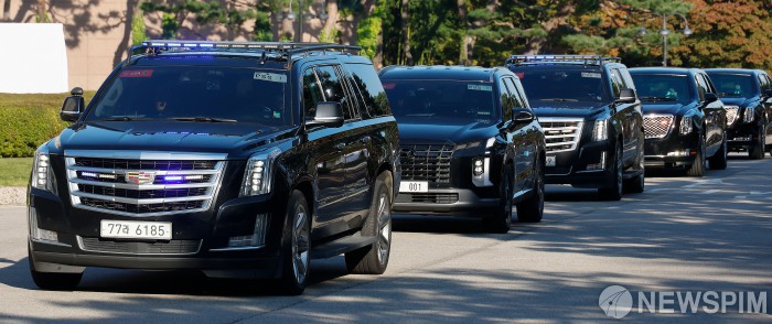 [경주=뉴스핌] 류기찬 기자 = 아시아태평양경제협력체(APEC) 정상회의에 참석하는 미국 도널드 트럼프 대통령의 방한일인 29일 오전 경북 경주시 힐튼호텔 경주 인근에서 미국 정부 소속으로 추정되는 경호 관계자들이 경호차량을 타고 이동하고 있다. 2025.10.29 ryuchan0925@newspim.com