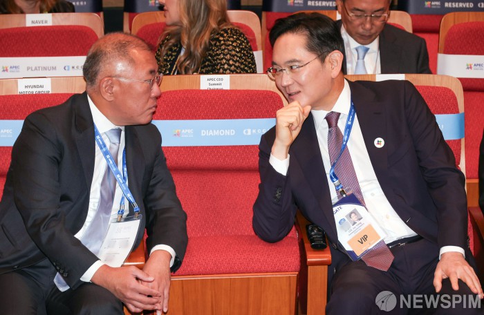 [서울=뉴스핌] 이재용 삼성전자 회장(오른쪽)과 정의선 현대자동차 그룹 회장이 29일 오전 경북 경주 화백컨벤션센터에서 열린 2025년 APEC CEO 서밋에서 대화를 나누고 있다. [사진=APEC 2025 KOREA & 연합뉴스] 2025.10.29 photo@newspim.com