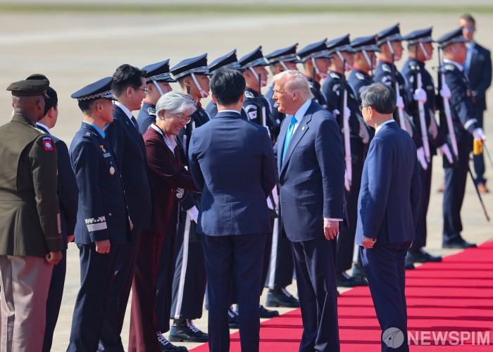 [서울=뉴스핌] 도널드 트럼프 미국 대통령이 29일 김해공항에 도착해 강경화 주미국대한민국대사관 대사와 인사를 나누고 있다. [사진=APEC 2025 KOREA & 연합뉴스] 2025.10.29 photo@newspim.com