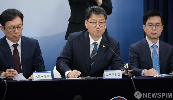 [서울=뉴스핌] 이길동 기자 = 김용수 국무조정실 국무2차장이 30일 오전 서울 종로구 정부서울청사에서 부동산 불법행위 대응 관계 부처 합동브리핑을 하고 있다. 왼쪽부터 김규철 국토교통부 주택토지실장, 김용수 국무2차장, 신진창 금융위원회 사무처장 2025.10.30 gdlee@newspim.com