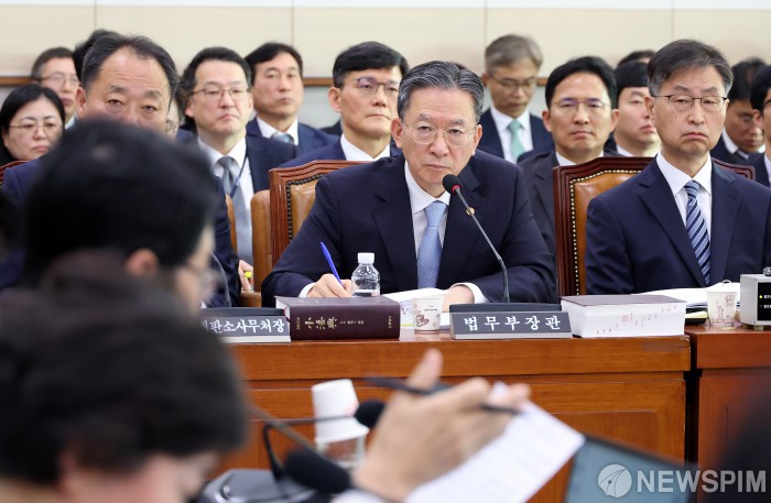[서울=뉴스핌] 정일구 기자 = 정성호 법무부 장관이 30일 오전 서울 여의도 국회 법제사법위원회에서 열린 법무부 등에 대한 종합감사에서 주진우 국민의힘 의원 질의를 경청하고 있다. 2025.10.30 mironj19@newspim.com