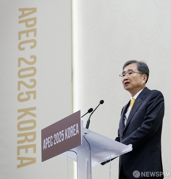 [경주=뉴스핌] 류기찬 기자 = 조현 외교부 장관이 30일 오후 경북 경주시 국제미디어센터에서 외교통상합동각료회의(AMM) 브리핑을 하고 있다. 2025.10.30 ryuchan0925@newspim.com