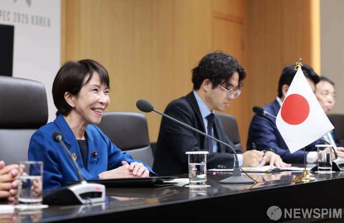 [서울=뉴스핌] 다카이치 사나에 일본 총리가 30일 경북 경주 APEC 정상회의장에서 열린 이재명 대통령과의 한일 정상회담에서 발언하고 있다. [사진=APEC 2025 KOREA & 연합뉴스] 2025.10.30 photo@newspim.com