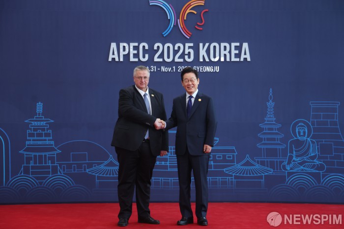 [서울=뉴스핌] 이재명 대통령이 31일 오전 경북 경주시 경주화백컨벤션센터(HICO)에서 열린 2025 아시아태평양경제협력체(APEC) 정상회의에 참석한 알렉세이 오베르추크 러시아 국제부총리와 기념 사진을 촬영하고 있다. [사진=APEC 2025 KOREA & 연합뉴스] 2025.10.31 photo@newspim.com