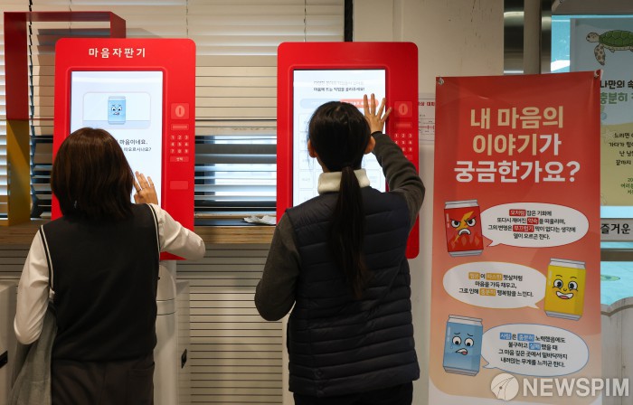 [고양=뉴스핌] 최지환 기자 = 저동고등학교 재학생들이 31일 오후 경기 고양시 저동고등학교에서 열린 '2025 경기도교육청 찾아가는 생명존중 캠페인'에서 AI 기반 마음상담 기기 '위로미'를 체험하고 있다. 2025.10.31 choipix16@newspim.com