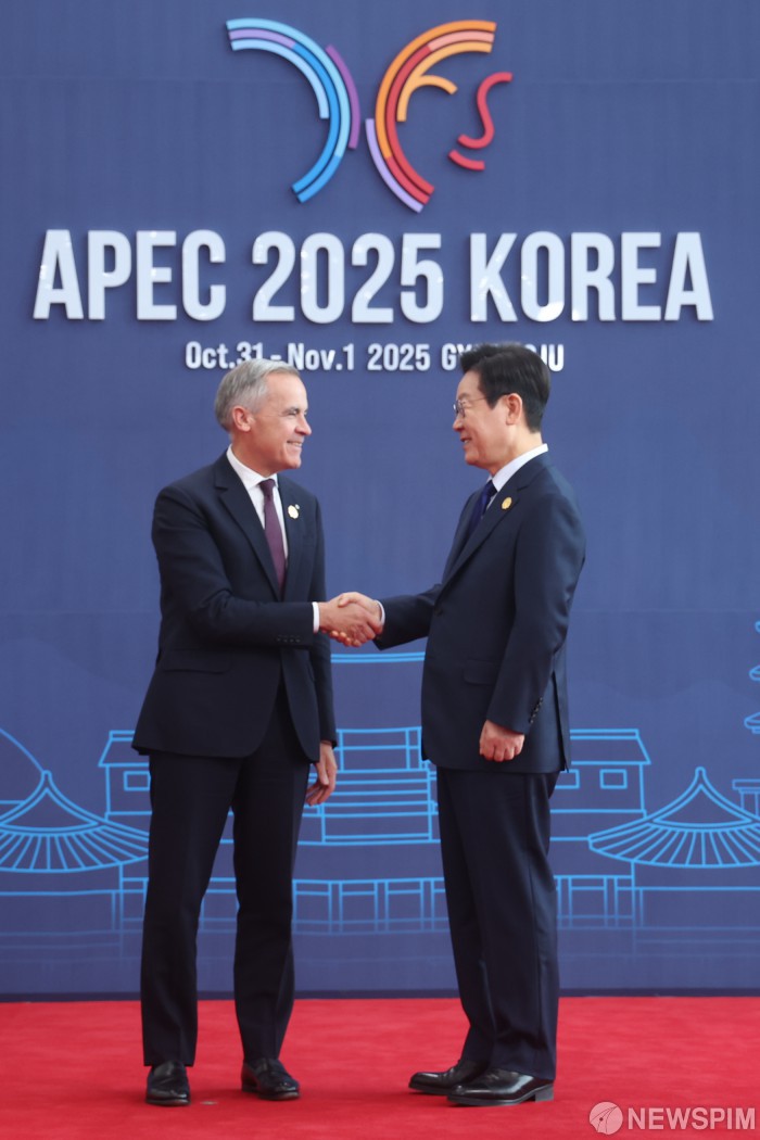 [서울=뉴스핌] 이재명 대통령이 31일 오전 경북 경주시 경주화백컨벤션센터(HICO)에서 열린 2025 아시아태평양경제협력체(APEC) 정상회의에 참석한 마크 카니 캐나다 총리를 맞이하고 있다. [사진=APEC 2025 KOREA & 연합뉴스] 2025.10.31 photo@newspim.com