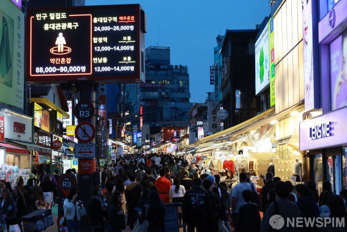 [서울=뉴스핌] 김학선 기자 = 핼러윈 데이인 31일 인파 밀집 지역인 서울 마포구 홍대 거리에 인파 사고를 대비한 안전홍보판이 설치되어 있다. 2025.10.31 yooksa@newspim.com