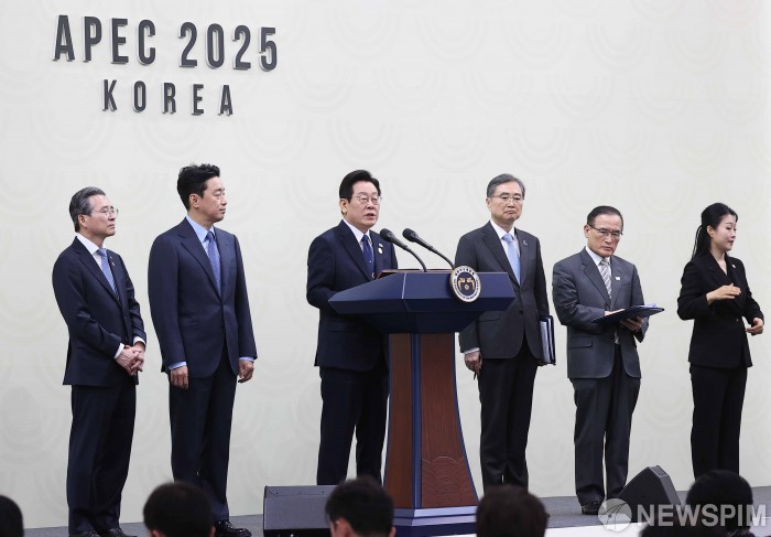 [경주=뉴스핌] 윤창빈 기자 = 이재명 대통령이 1일 경북 경주시 경주화백컨벤션센터(HICO) 인근 국제미디어센터(IMC)에서 2025 APEC 기자회견을 하고 있다. 왼쪽부터 김용범 정책실장, 강훈식 비서실장, 이 대통령, 조현 외교부 장관, 위성락 안보실장. 2025.11.01 pangbin@newspim.com