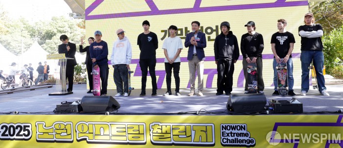 [서울=뉴스핌] 양윤모 기자 = 오승록 노원구청장이 1일 오후 서울 노원구 노해체육공원에서 열린 ‘노원 익스트림 챌린지’ 개막 행사에서 X-게임 참가 선수들과 기념촬영을 하고 있다. 지난해 리모델링을 통해 조성된 노해체육공원의 ‘노원X-TOP’은 동북권 유일의 X-게임 전용 공간이다. 콘크리트 재질을 활용해 안전성을 확보했고, 다양한 익스트림 스포츠 장르를 소화할 수 있도록 3개의 섹션으로 구성된 것이 특징이다. 구는 이 공간을 활용해 도전을 추구하는 이들의 열정과 도전 정신을 응원하고자 스포츠 문화 축제를 마련했다. [사진=노원구청] 2025.11.01 yym58@newspim.com