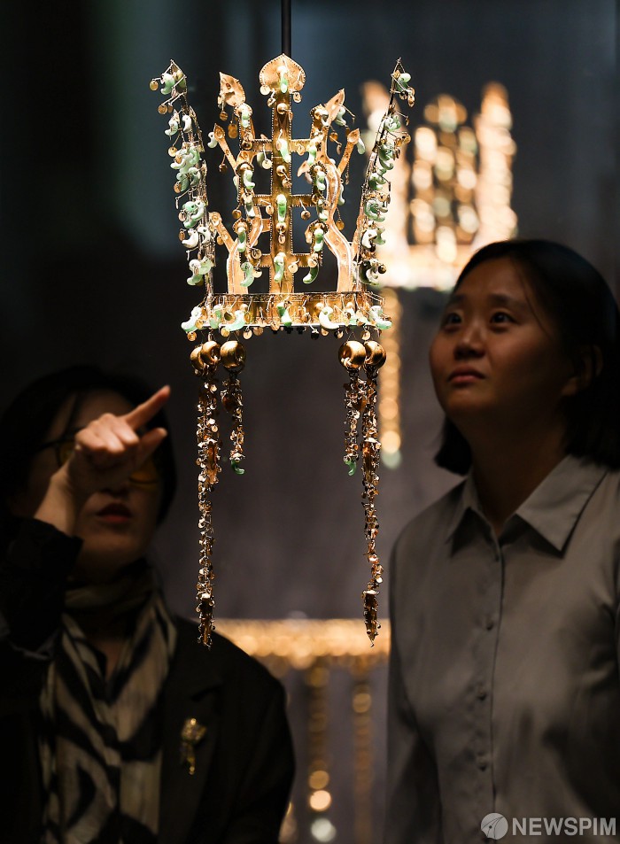 | [서울=뉴스핌] 27일 국립경주박물관에서 열린 아시아태평양경제협력체(APEC) 정상회의·박물관 개관 80주년 기념 특별전 '신라 금관, 권력과 위신' 언론 공개회에서 신라 금관이 공개되고 있다. [사진=APEC 2025 KOREA & 연합뉴스] 2025.10.27 photo@newspim.com |
