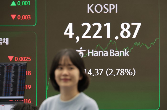 | [서울=뉴스핌] 이길동 기자 = 3일 서울 중구 하나은행 딜링룸에 코스피 지수가 표시되어 있다. 이날 코스피는 전 거래일보다 114.37p(2.78%) 오른 4,221.87에 코스닥 지수는 전 거래일보다 14.13p(01.57%) 오른 914.55에 거래를 마감했다. 서울 외환시장에서 달러/원 환율은 전 거래일 주간거래 종가 대비 3.50원 상승한 1,427.90원에 주간 거래를 마감했다.2025.11,03 gdlee@newspim.com |