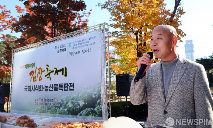 [서울=뉴스핌] 양윤모 기자 = 3일 오대산천축제위원회(위원장 장문혁)가 서울 여의도 국회 소통관 앞 야외 광장에서 진행한 '2025 평창고랭지김장축제 국회 홍보체험행사'에서 장문혁 축제위원장이 인사말을 하고 있다. [사진=오대산천축제위원회] 2025.11.03 yym58@newspim.com