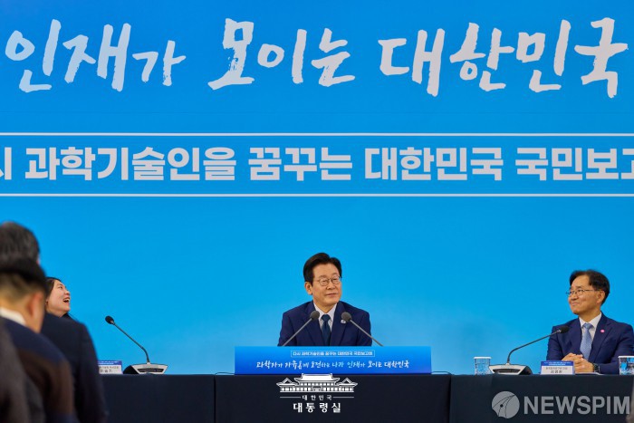 [서울=뉴스핌] 이재명 대통령이 7일 대전 유성구 국립중앙과학관에서 열린 다시 과학기술인을 꿈꾸는 대한민국 국민보고회에 자리하고 있다. [사진=대통령실] 2025.11.07 photo@newspim.com