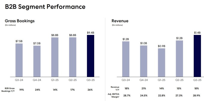 시애틀에 본사를 둔 익스피디아는 3분기 B2B 부문 예약이 전년 동기 대비 26% 증가했다고 밝혔다. 이 부문은 기업 여행 관리 회사, 오프라인 여행사, 금융기관 등을 대상으로 서비스를 제공하고 있다.
