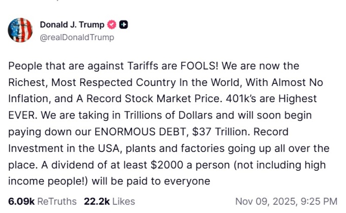 9일(현지시간) 트럼프 대통령은 자신의 소셜미디어(SNS) 트루스소셜에서 관세 비판론자들을 "바보들(fools)"이라고 부르며, 미국 정부가 "수조 달러를 걷어들이고 있으며, 곧 37조 달러에 달하는 막대한 국가부채를 갚기 시작할 것"이라고 적었다.