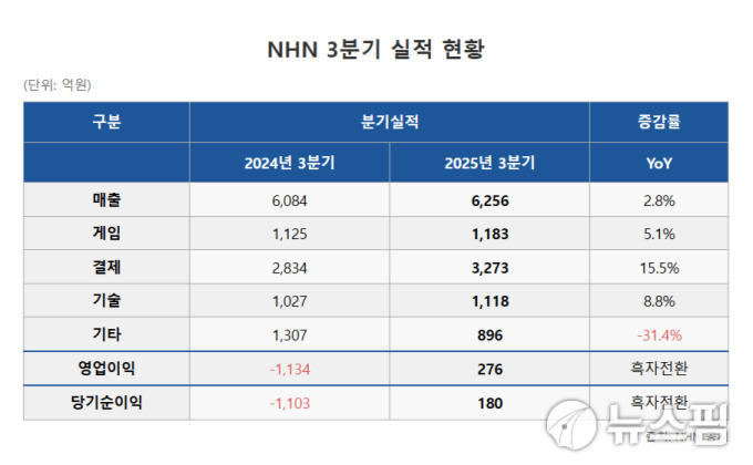 [서울=뉴스핌] 이성화 기자 = 엔에이치엔(NHN)이 게임과 결제, 기술 부문에서 고른 성장세를 보이며 올해 3분기 흑자 전환에 성공했다. 내년에는 신작 출시와 정부가 주도하는 인공지능(AI) 사업 참여를 통해 성장세를 지속할 계획이다.